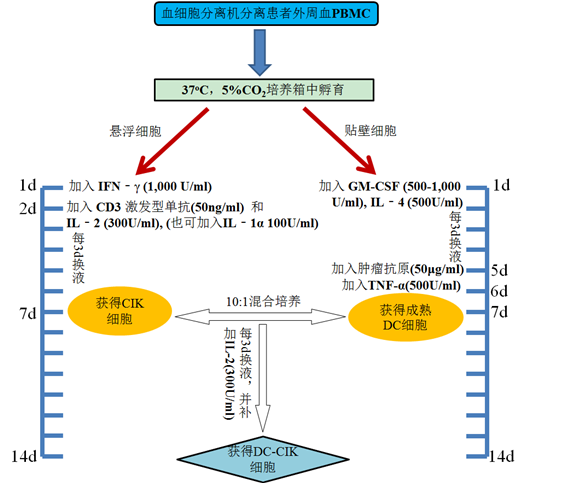 将CIK细胞和同源DC细胞共培养后即可获得DC-CIK细胞。它既可促进DC细胞的成熟,更能促进ClK的增殖,并加强其抗肿瘤活性。DC细胞是机体免疫应答的始动者,能够诱导持久有力的特异性抗肿瘤免疫反应;CIK细胞可通过非特异性免疫杀伤作用清除肿瘤患者体内微小残余病灶,所以负载肿瘤抗原的DC与CIK的有机结合(即DC-CIK细胞)能产生特异性和非特异性的双重抗肿瘤效应。