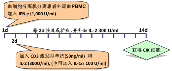 IFN-γ具有上调外周血淋巴细胞表面IL-2R表达的作用,因此会增强T细胞对IL-2促增殖反应的敏感度和强度。在诱导CIK细胞形成的过程中加入IFN-γ,可降低IL-2的用量。研究发现,IFN-γ加入的顺序与CIK的细胞毒活性密切相关。先加入IFN-γ,培养24后再加入IL-2,可明显提高CIK的细胞毒活性。
