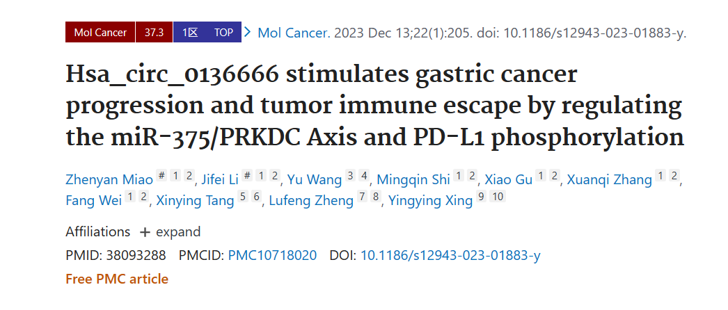 标题:Hsa_circ_0136666 stimulates gastric cancer progression and tumor immune escape by regulating the miR-375/PRKDC Axis and PD-L1 phosphorylation