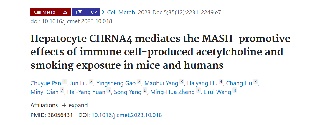 标题:Hepatocyte CHRNA4 mediates the MASH-promotive effects of immune cell-produced acetylcholine and smoking exposure in mice and humans