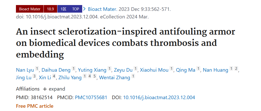 标题:An insect sclerotization-inspired antifouling armor on biomedical devices combats thrombosis and embedding