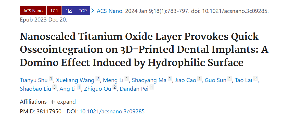 标题:Nanoscaled Titanium Oxide Layer Provokes Quick Osseointegration on 3D-Printed Dental Implants: A Domino Effect Induced by Hydrophilic Surface