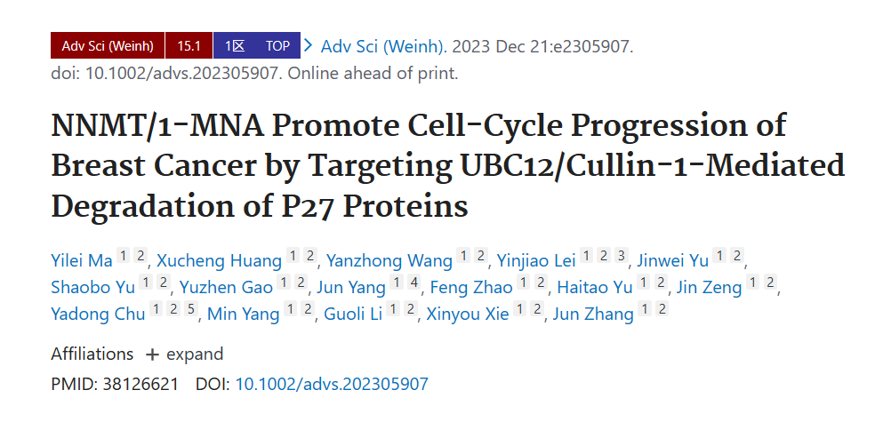 标题:NNMT/1-MNA Promote Cell-Cycle Progression of Breast Cancer by Targeting UBC12/Cullin-1-Mediated Degradation of P27 Proteins