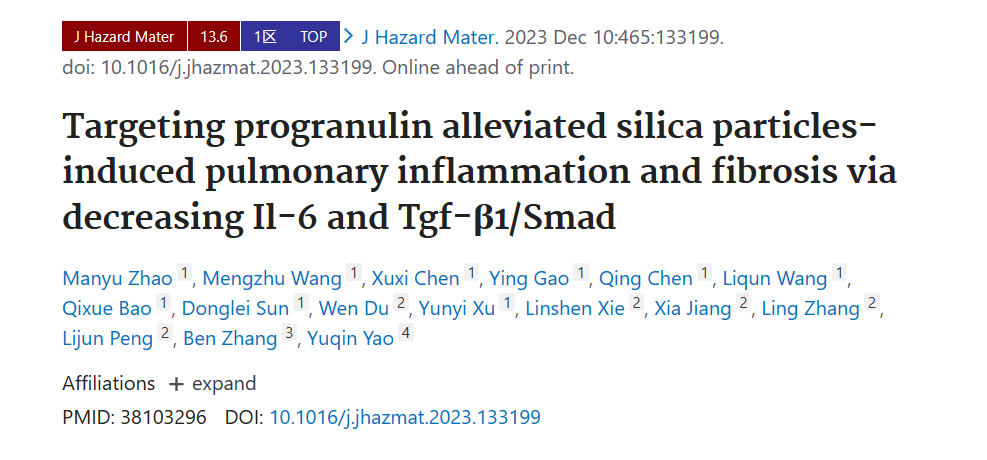 标题:Targeting progranulin alleviated silica particles-induced pulmonary inflammation and fibrosis via decreasing Il-6 and Tgf-β1/Smad