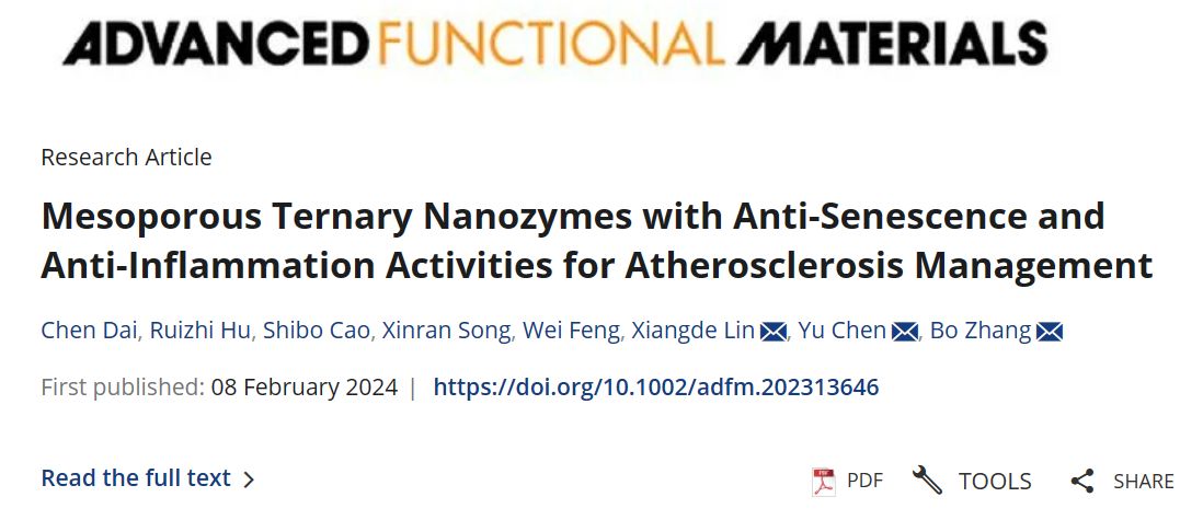 标题:Mesoporous Ternary Nanozymes with Anti-Senescence and Anti-Inflammation Activities for Atherosclerosis Management