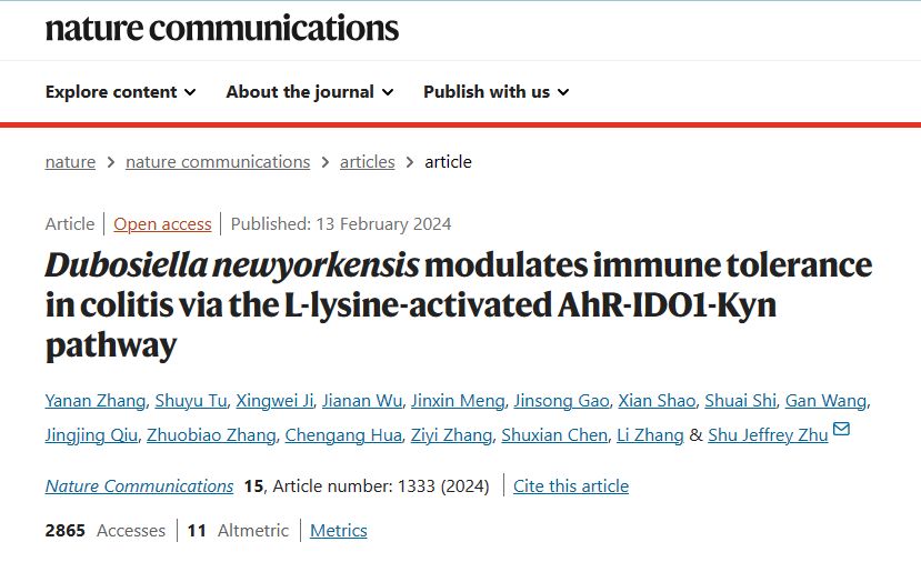 标题:Dubosiella newyorkensis modulates immune tolerance in colitis via the L-lysine-activated AhR-IDO1-Kyn pathway