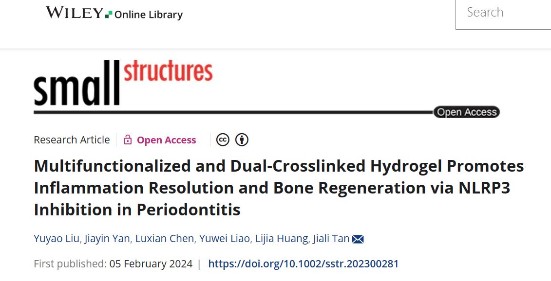 标题:Multifunctionalized and Dual-Crosslinked Hydrogel Promotes Inflammation Resolution and Bone Regeneration via NLRP3 Inhibition in Periodontitis