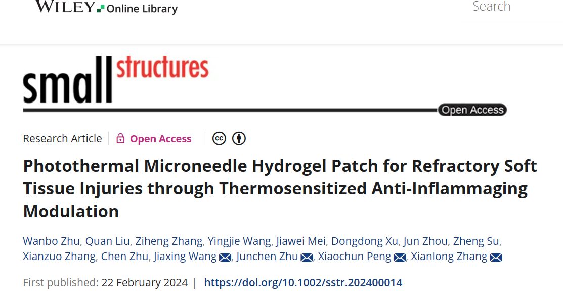 标题:Photothermal Microneedle Hydrogel Patch for Refractory Soft Tissue Injuries through Thermosensitized Anti-Inflammaging Modulation