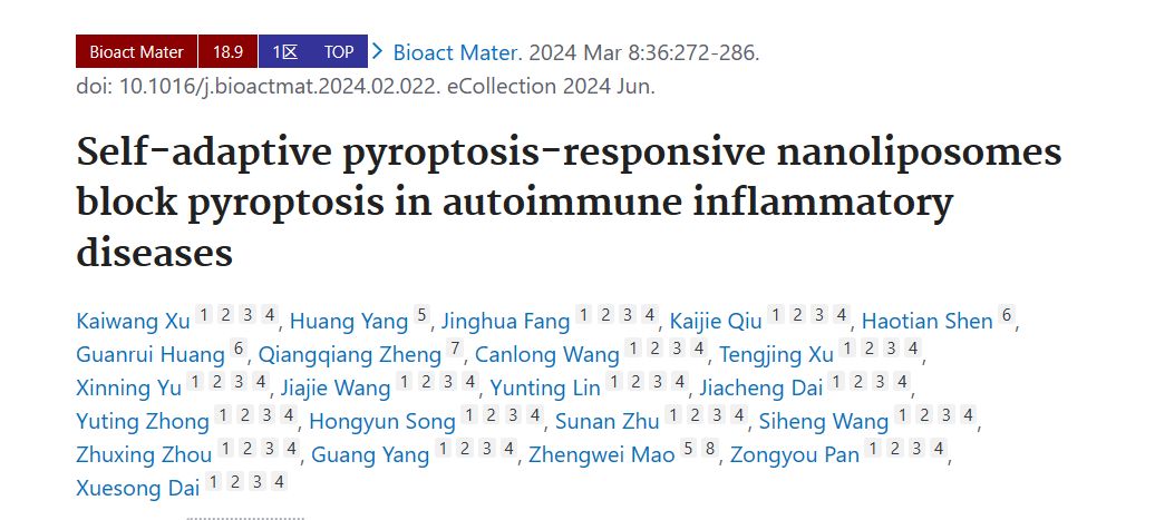 标题:Self-adaptive pyroptosis-responsive nanoliposomes block pyroptosis in autoimmune inflammatory diseases