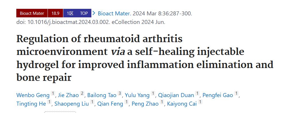 标题:Regulation of rheumatoid arthritis microenvironment via a self-healing injectable hydrogel for improved inflammation elimination and bone repair