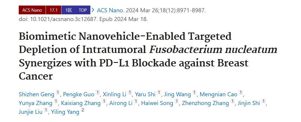 标题:Biomimetic Nanovehicle-Enabled Targeted Depletion of Intratumoral Fusobacterium nucleatum Synergizes with PD-L1 Blockade against Breast Cancer