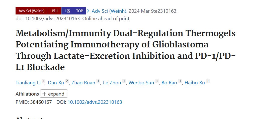 标题:Metabolism/Immunity Dual-Regulation Thermogels Potentiating Immunotherapy of Glioblastoma Through Lactate-Excretion Inhibition and PD-1/PD-L1 Blockade