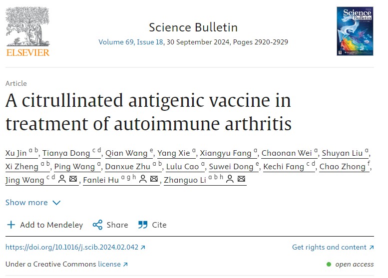 类风湿关节炎(RA)是一种由环境和遗传风险因素触发的炎症性自身免疫性疾病,由抗原肽引发。已有研究表明,抗原特异性靶向治疗可能是RA的一种有前景的治疗策略,它通过恢复对自身抗原的免疫耐受性而不损害正常免疫功能。抗原的瓜氨酸化会增强其抗原性并诱导自身免疫反应。本研究表明,瓜氨酸化抗原(citAg)疫苗可改善胶原诱导的关节炎,表现为T辅助细胞1(Th1)和Th17细胞数量减少,下调包括IL-6和TNF-α在内的促炎细胞因子,并抑制抗原再激发反应。B细胞受体测序进一步揭示,citAg疫苗能够抑制失调的V(D)J重组,恢复免疫库。综上所述,研究结果表明citAg疫苗可能对RA具有治疗效果。
