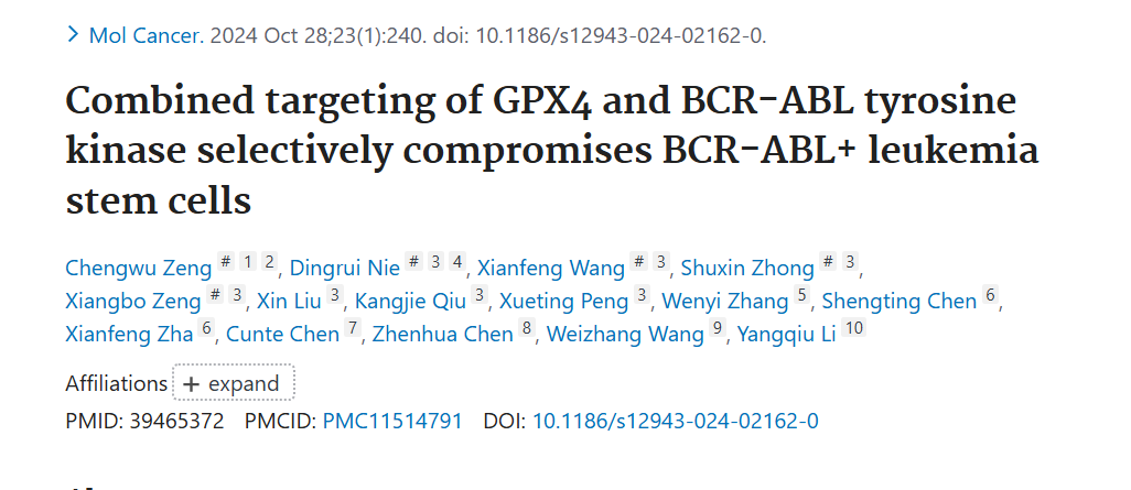 标题:Combined targeting of GPX4 and BCR-ABL tyrosine kinase selectively compromises BCR-ABL+ leukemia stem cells