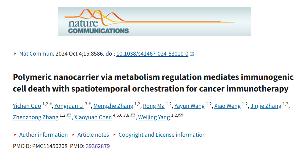 标题:Polymeric nanocarrier via metabolism regulation mediates immunogenic cell death with spatiotemporal orchestration for cancer immunotherapy
