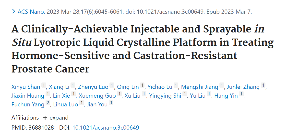标题:A Clinically-Achievable Injectable and Sprayable in Situ Lyotropic Liquid Crystalline Platform in Treating Hormone-Sensitive and Castration-Resistant Prostate Cancer