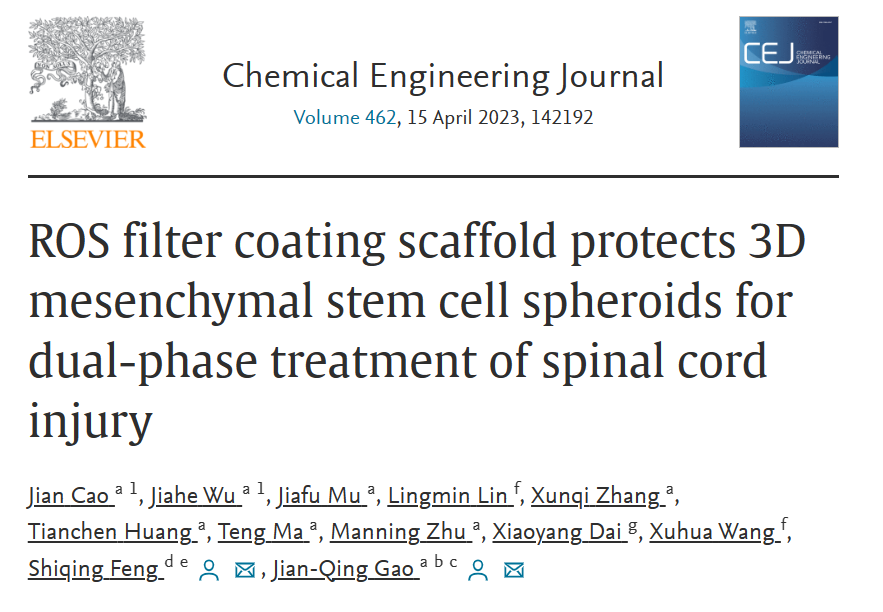 标题:ROS filter coating scaffold protects 3D mesenchymal stem cell spheroids for dual-phase treatment of spinal cord injury