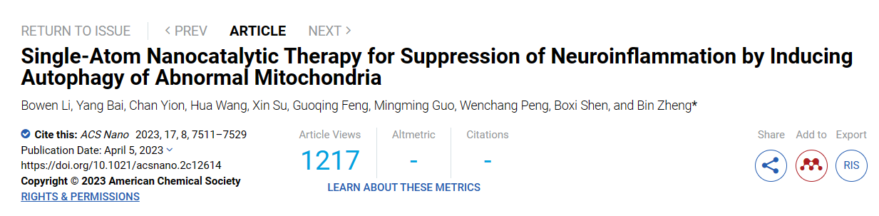 标题:Single-Atom Nanocatalytic Therapy for Suppression of Neuroinflammation by Inducing Autophagy of Abnormal Mitochondria