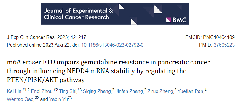 m6A eraser FTO impairs gemcitabine resistance in pancreatic cancer through influencing NEDD4 mRNA stability by regulating the PTEN/PI3K/AKT pathway
