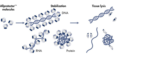 图4 Allprotect稳定的机理:每个Allprotector分子具有多个允许Allprotector分子包被并保护DNA、RNA和蛋白质的接触点。组织裂解时,Allprotector分子被稀释、分解,释放出DNA、RNA和蛋白质。 |