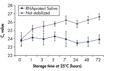 图3 RNAprotect® Saliva Reagent 稳定了唾液中β-actin mRNA 的水平,mRNA 通过 real-time RT-PCR 定量。 |