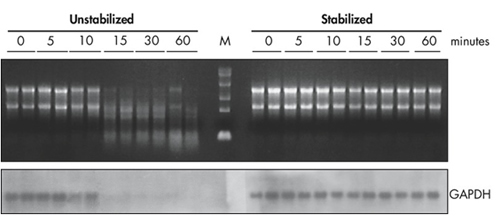 图2 大鼠肾脏组织经 RNeasy Protect Mini Kit 稳定后,室温放置 60 分钟,仍可以纯化到完整地 RNA;而使用常规方法,组织放置一段时间后 RNA 遭到降解。 |