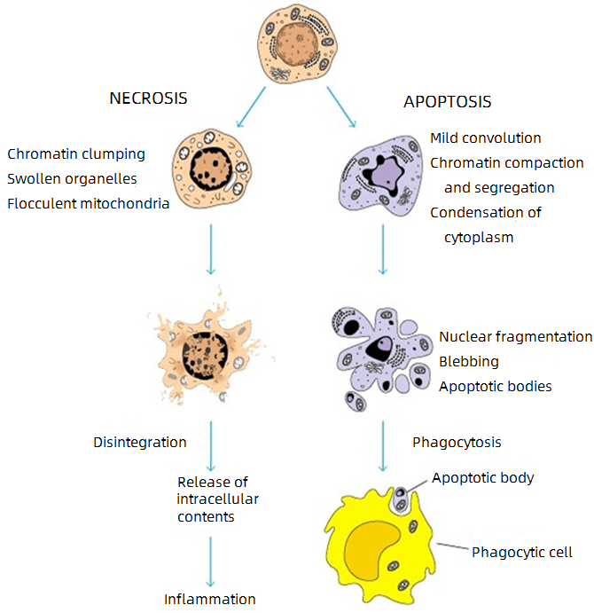 细胞死亡的方式主要分为凋亡、坏死、自噬和焦亡4类。其中凋亡属于细胞的“自杀”行为,而坏死是由外来因素(化学、物理、生物等因素)作用引起的细胞意外的被动的死亡,属于细胞的“他杀”行为。以下列出细胞凋亡与坏死的部分区别: