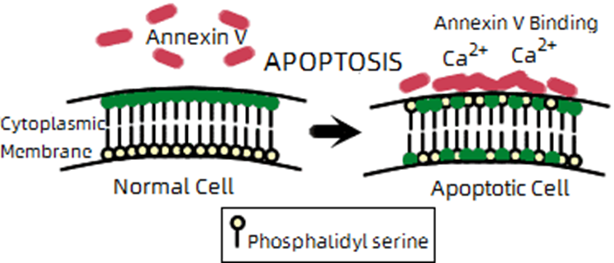 磷脂酰丝氨酸(PS)是一种带负电荷的磷脂,在正常细胞中,PS分布于细胞膜脂质双层的内侧,当细胞发生凋亡时,细胞膜上这种磷脂分布的不对称性被破坏而使PS暴露在细胞膜外。Annexin V 是一种Ca2+依赖的磷脂结合蛋白,在高钙环境下,Annexin V高亲和力结合PS,通过检测标记Annexin V的荧光判断PS是否发生外翻。
