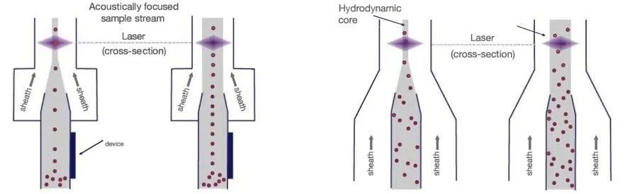 声波聚焦流式细胞仪可以使用超声波更好地将细胞聚焦于一条直线,进行激光照射。即使在较高的进样速度下,声波聚焦技术也可以精确地将细胞定位在液流的中心,因此细胞信号的变异系数较小,数据质量更高。作为对比,同样在高进样速度下,传统的流体动力学聚焦由于鞘液压力相对变小,样本流的中心部分变宽,导致信号变异系数增大、数据质量下降。此外,声波聚焦的方式允许更高的上样量,并能够减少样品堵塞。声波聚焦流式细胞仪可以利用多达4种激光和14个荧光通道对样本进行检测。