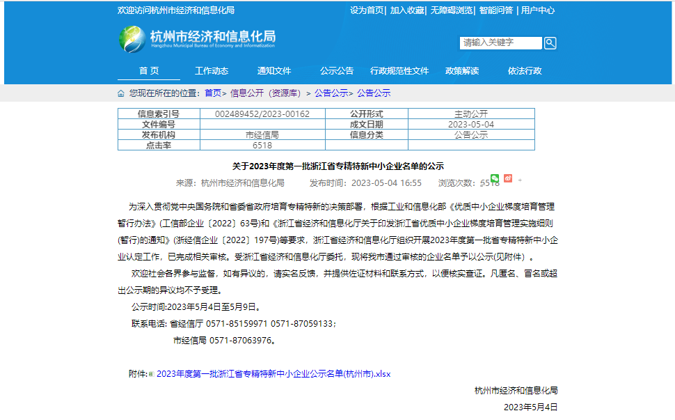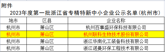 近日,浙江省经济和信息化厅组织开展 2023 年度第一批省级专精特新中小企业认定工作已完成相关审核和公示,杭州联科生物技术股份有限公司荣列“2023年度第一批浙江省专精特新中小企业”名单。
