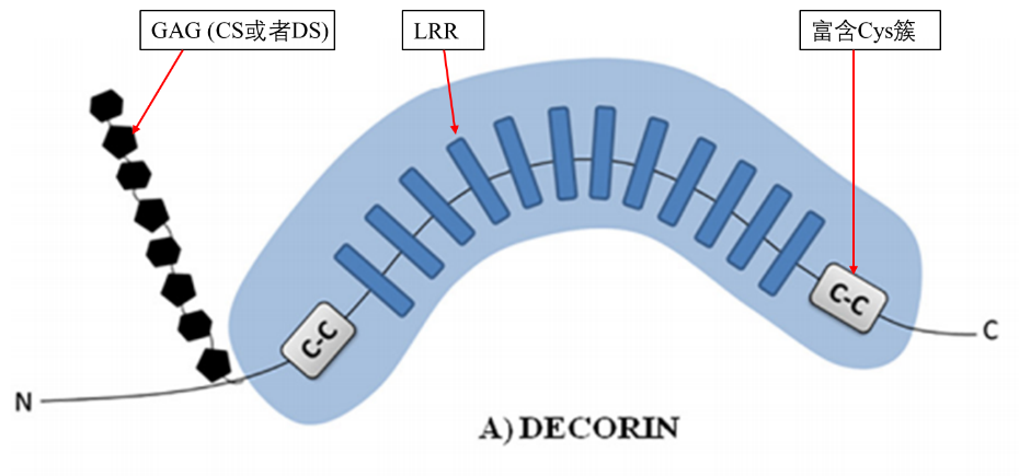 Decorin常用别名有PG40, PGII, PGS2等。人类decorin基因定位于染色体12q23,长度超过38kb,包含9个外显子。在小鼠中,该基因位于10号染色体上。Decorin有一个大约40 kda的核心蛋白,由10-12个富含亮氨酸的重复序列(LRR)基序组成一个弯曲的螺线管形,两侧都有富含半胱氨酸的簇。尽管存在三个潜在的糖胺聚糖或称粘多糖(glycosaminoglycan ,GAG)的连接位点,但只有一个位点连接约40kDa的单个GAG链(或者是硫酸软骨素CS或者是硫酸皮肤素DS),由此产生一个表观分子量约为130kDa的分子。