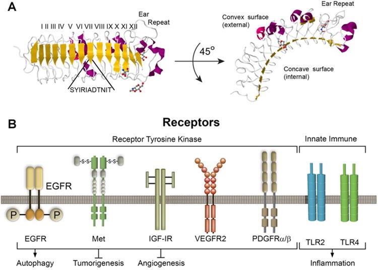 图2. (A)图示单体牛Decorin结构(PDB accession #: 1XKU)。(B)Decorin各种RTK和天然免疫受体的示意图