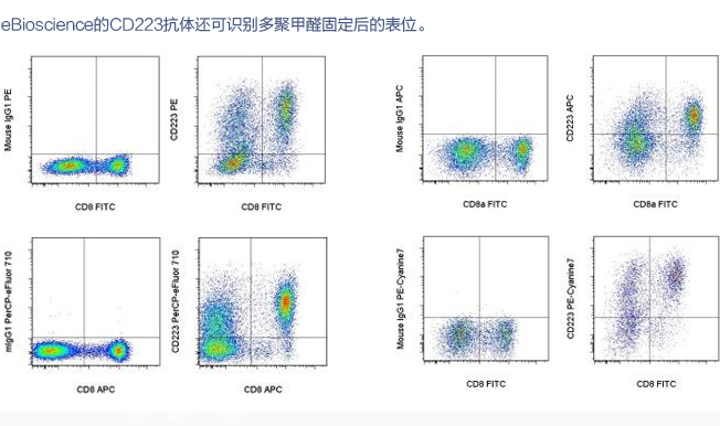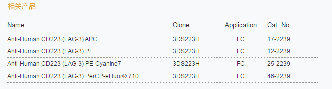 ![]() CD223,即淋巴细胞活化基因3(LAG-3),其结合MHCII比CD4具有更高亲和力,所以被认为与T细胞活化的负调控以及稳态增殖有关。LAG-3有报道说在活化的T细胞(包括调节性T细胞)以及NK细胞上表达。CD8+T细胞上通常比CD4+T细胞表达更多的LAG-3。 LAG-3与CD49b的共表达被推荐用于鉴定人和小鼠的Tr1细胞。