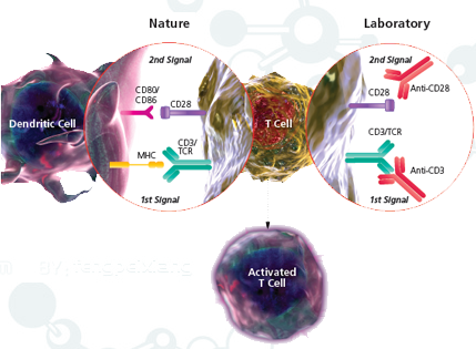 完全活化的T细胞至少需要2个信号。第一信号是TCR捕获抗原递呈细胞通过MHC递呈的肽,第二信号是在T细胞表面表达的共刺激分子与APC上配体结合时产生。这些活化信号一起被传递到T细胞的核内并且产生以下效应: