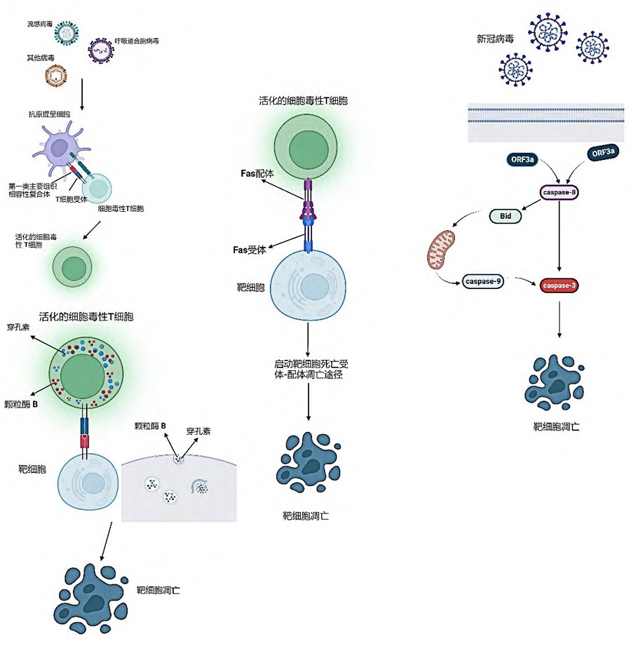 一方面,宿主细胞主动性凋亡引起被感染细胞死亡,同时达到清除病毒的效果,在机体防御病毒感染过程中起重要作用。另一方面,病毒亦主动诱导或抑制宿主细胞凋亡,以达到在机体内复制产生更多子代病毒并完成生活周期的目的,并造成持续性感染,甚至肿瘤发生。