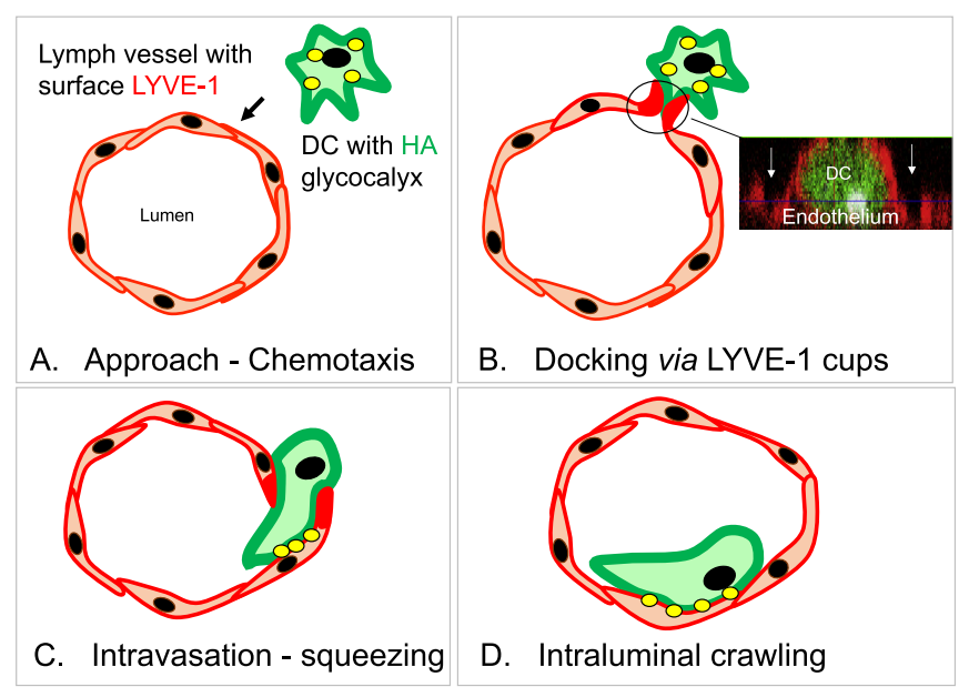 表面HA糖萼和LYVE-1之间的相互作用对于成熟BMDC粘附到淋巴管内皮细胞和随后的转归至关重要。透明质酸介导的DC粘附于内皮细胞,在接触点触发了LYVE-1排列的环状结构的形成,这些富含LYVE-1的实体逐渐包围DCs,并最终将其包裹。相对较弱的LYVE-1·HA相互作用可能因此产生低摩擦、滑动或“蜗牛粘液”样界面,允许DC沿着表面迁移,通过变形虫运动寻找入口点的内皮细胞。