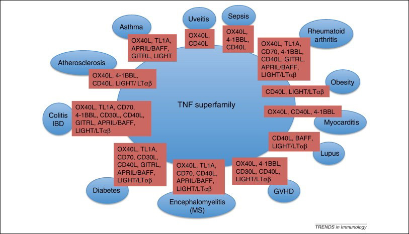 - Michael Croft et al. TNF superfamily in inflammatory disease: translating basic insights. Review Trends Immunol. 2012. 33(3):144-52.