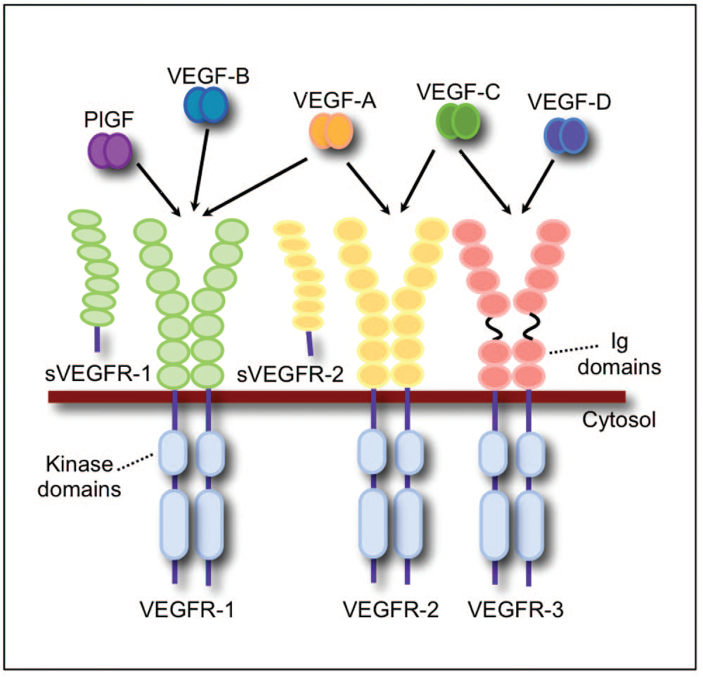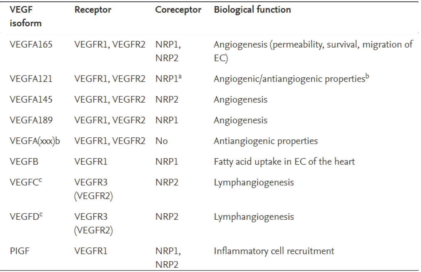 01 VEGF家族成员及受体 在人类中,血管内皮生长因子VEGF超家族由几个成员组成:VEGF-A、VEGF-B、VEGF-C、VEGF-D、PlGF(planta growth factor,胎盘生长因子)(图1)。促动素1(prokineticin 1)又称内分泌腺源性血管内皮生长因子(EG-VEGF),虽以VEGF命名,却不属于VEGF超家族。 VEGF-A(VEGF)基因由8个外显子组成,选择性剪接产生10种以上亚型。主要异构体VEGF-A165,缺少外显子6编码的残基。所有的异构体都有外显子1-5编码的区域。外显子6和7(在某些异构体中缺失)可能是导致肝素亲和力不同的区域,外显子8(存在于所有异构体中)确保内皮细胞增殖。VEGF-A是血管生成最重要、最有效的刺激因子。VEGF不仅由内皮细胞分泌,也由其他细胞分泌,响应缺氧刺激。它在心肌成纤维细胞中表达,提示其在梗死后组织修复和重塑中的意义。 VEGF-B也发现有2种剪接形式:VEGF-B167 和VEGF-B186,VEGF-B167是常见亚型。在胚胎早期表达;在成人中,它存在于各种组织中,主要在心肌、骨骼肌和胰腺中。 VEGF-C在胚胎组织中大量表达,在成人中,它在心脏、卵巢、胎盘、肠、甲状腺等部位表达。 VEGF-D具有与VEGF-C相似的特性,在淋巴管生成中也起中心作用,但在血管生成中不起重要作用。在胚胎中,它在肺中含量很高,参与淋巴管的发育;在成人中,它存在于心脏、肺、骨骼肌、小肠。 PlGF(planta growth factor,胎盘生长因子)也是VEGF家族的一种生长因子,最早在人类胎盘组织中发现,它与滋养层生长和分化、滋养层侵袭和胚泡植入有关。也存在选择性剪切,产生4种不同的亚型:PlGF-1(PlGF131)、PlGF-2(PlGF152)、PlGF-3(PlGF203)和PlGF-4(PlGF224)。它没有直接的促有丝分裂作用,不增加血管通透性。 VEGF家族成员通过与三个酪氨酸激酶型受体VEGF受体(VEGFR1、VEGFR2、VEGFR3)(图1)和两个称为Neuropilins(NP-1、NP-2)的共同受体相互作用发挥作用(表1)。VEGFA、B和PLGF与VEGFR1结合,VEGFA和E与VEGFR2结合,VEGFC和D与VEGFR3结合(图1)。VEGF家族成员和受体的不同组合介导组织特异性效应。VEGFR-1和VEGFR-2主要表达于血管内皮细胞,VEGFR-3主要表达于淋巴管内皮细胞。VEGFR-2的促血管生成活性和酪氨酸激酶活性比VEGFR-1强。内皮细胞也表达共受体,如NP-1和NP-2,它们调节酪氨酸激酶受体的活性。 VEGFR1表达两种形式的mRNA:一种是含有酪氨酸激酶的全长VEGFR1/Flt-1受体;另一种是仅携带配体结合区的可溶性形式(sFlt-1/sVEGFR1),通过捕获其配体VEGF-A、PlGF和VEGF-B发挥诱饵受体的功能。因此,VEGFR1依赖的炎症和非炎症反应也受全长和可溶性VEGFR1基因表达平衡的调控。sVEGFR-1可以作为配体的竞争性抑制剂,作为一种可能的生物标志物,在癌症和其他疾病如子痫前期中发挥重要作用。可溶性VEGFR2也在小鼠和人内皮细胞培养基中发现,可能来源于可变剪切或者蛋白水解。在人类中,VEGFR3也存在2个转录本。其中较短的转录本编码一种缺乏C末端65个氨基酸的蛋白质。这两种异构体的生物活性也不同。 三种血管内皮生长因子受体(VEGFRs)在发育过程中和成人体内调节血管内皮细胞、造血细胞和淋巴管内皮细胞的功能。其中许多过程需要平衡的VEGFR信号,这涉及多个VEGFR。 表1. VEGFs受体、共受体及功能 02 VEGF家族参与的生理病理过程 VEGF-A 在新血管的生长和成熟早期具有重要的限速作用。VEGF缺失小鼠在胚胎组织中表现出血管缺陷和胚胎致死性。VEGF-A还会引起细胞增殖、凋亡抑制、血管通透性增加、血管扩张、炎症细胞向损伤部位募集等。VEGF-A也可能促进绒毛外滋养细胞的迁移和侵袭。在子痫前期和IUGR患者中,胎盘表达和血清VEGF和PIGF水平较低。 VEGF-B 在血管生成中的作用并不重要,VEGF-B–/–纯合子小鼠在出生时可以存活,只有中度心血管系统缺陷。目前,人们认为,在成人中,VEGF-B更多地参与某些细胞类型的存活,例如:平滑肌细胞、内皮细胞、周细胞、神经元(脊髓、皮层或视网膜的运动神经元)、心肌细胞,而不是血管生成。几项实验表明,阻断小鼠大脑中动脉后再给予VEGF-B,可抑制皮层神经元凋亡,并使脑梗死面积缩小。 VEGF-C 对VEGFR-3有很高的亲和力,VEGFR-3在内皮淋巴细胞上表达,促进淋巴管生成。在纯合VEGF-C–/–小鼠中,淋巴管的发育自初始阶段起就发生了改变,其结果是组织中的间质液积聚,有时可能致命。VEGF-C的过度表达与淋巴管网络发育良好相关,人VEGF-C(phVEGF-C)的基因转移可能代表淋巴水肿患者的一种新的治疗策略。 VEGF-D 具有与VEGF-C相似的特性,在淋巴管生成中也起着中心作用,但不是血管生成中的重要因子。在成人中,它存在于心脏、肺、骨骼肌、小肠。它与VEGFR-3和NP-2有亲和力。VEGF-D基因失活只会导致淋巴循环中度萎缩,而没有其他显著变化。 PIGF 与滋养层生长和分化、滋养层侵袭和胚泡植入有关。PlGF在胚胎血管生成中不起重要作用,而是通过与VEGF-A的协同作用干预病理性血管生成(缺血、炎症、癌症)。 VEGFs-VEGFR 系统与血管生成和淋巴管生成密切相关。VEGFR2具有很强的酪氨酸激酶活性,因此,主要和直接的血管生成信号是由VEGFR2产生的。VEGFR3在淋巴管内皮细胞中特异表达,产生淋巴管生成的主要信号。VEGFR1在巨噬细胞系细胞(如单核细胞)的膜上表达良好,为这些细胞的迁移和细胞因子/趋化因子的产生传递重要信号。这种VEGFR1巨噬细胞轴刺激各种组织中非炎症和炎症反应,参与如肿瘤生长、肿瘤转移、淋巴管生成、关节炎和动脉粥样硬化等过程。另外,对骨髓重建和伤口愈合等生理恢复系统也很重要