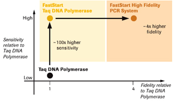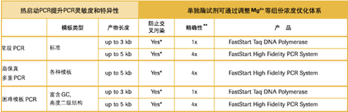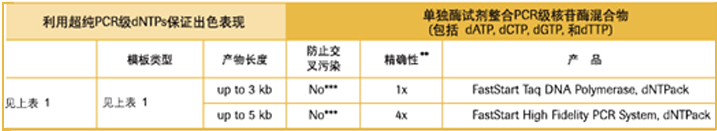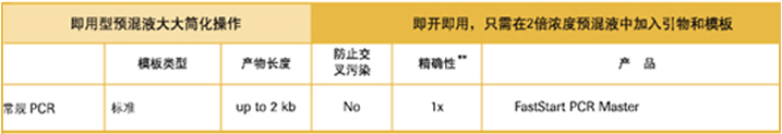 | 常规PCR实验中,PCR引物在室温状态下经常与DNA模板发生非特异性结合,普通Taq DNA聚合酶增加了非特异性片段被扩增的可能性;热启动PCR使用的聚合酶被修饰后在低温状态下不具有活性而只在高温时有活性,保证引物特异性结合状态下特异性产物的有效扩增。 罗氏FastStart热启动酶技术采用化学修饰的方法,只需在第一个PCR循环开始前95℃加热2分钟去除热敏感的抑制基团,便能激活FastStart Taq DNA Polymerase或FastStart High Fidelity PCR System的DNA聚合酶活性,就可进行PCR扩增反应。 表1 表2 表3
