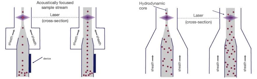 声波聚焦流式细胞仪可以使用超声波更好地将细胞聚焦于一条直线,进行激光照射。即使在较高的进样速度下,声波聚焦技术也可以精确地将细胞定位在液流的中心,因此细胞信号的变异系数较小,数据质量更高。作为对比,同样在高进样速度下,传统的流体动力学聚焦由于鞘液压力相对变小,样本流的中心部分变宽,导致信号变异系数增大、数据质量下降。此外,声波聚焦的方式允许更高的上样量,并能够减少样品堵塞。声波聚焦流式细胞仪可以利用多达4种激光和14个荧光通道对样本进行检测。