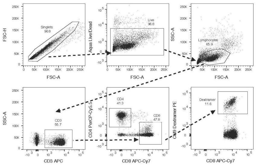 常规的流式细胞术分析,即选定目标细胞群所在区域(门控),并根据实验需要,选择参数对选定的细胞群进行分析。例如,辅助T细胞群先根据CD3+、CD4+的表达被选定。之后,再根据活化标记物(比如CD25)的表达选定活化细胞群所在区域,进行活化分析。