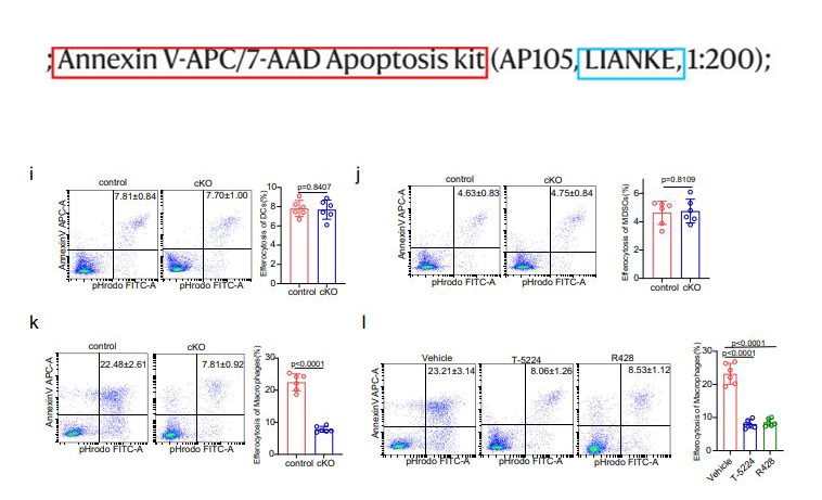 2024年4月1日,中国武汉大学中南医院放射科,精准医学研究所;转化医学中心Maosheng Cheng , Shuang Chen 老师在Nature Communications(IF=16.6)上,在线发表题为“CD276-dependent efferocytosis by tumor-associated macrophages promotes immune evasion in bladder cancer”的论文,此论文使用了联科生物Annexin V-APC/7-AAD Apoptosis Kit 细胞凋亡试剂盒(货号:AP105)