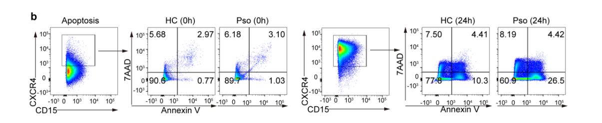 (b) Gating strategy and data for early/late apoptosis of CXCR4hi neutrophils cultured for 24 hours, related to Fig. 2c.