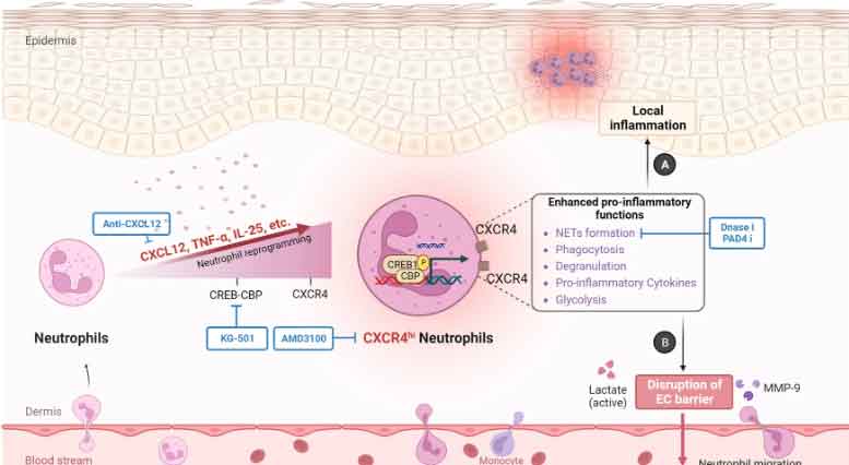 该研究发现,在银屑病患者中,趋化因子受体(CXCR4hi)中性粒细胞在血液和炎症皮肤中积累,并与疾病严重程度相关,CXCR4hi中性粒细胞在体外过量表达会促进炎细胞因子和趋化因子分化。中性粒细胞中的CXCR4表达依赖于环磷腺苷效应元件结合蛋白(CREB1),这是一种由肿瘤坏死因子(TNF)和基质细胞衍生因子-1(CXCL12)激活的转录因子。在体内,CXCR4hi中性粒细胞浸润加剧了皮肤炎症,而通过CXCR4或CXCL12抑制阻断CXCR4hi中性粒细胞会导致免疫反应的抑制。本研究确定了CREB1作为CXCR4hi中性粒细胞发育的关键调节因子,并证实了CXCR4hi中性粒细胞对血管重塑和炎症反应的贡献。