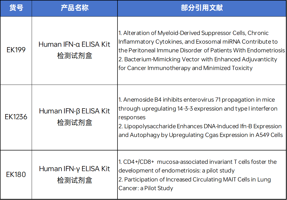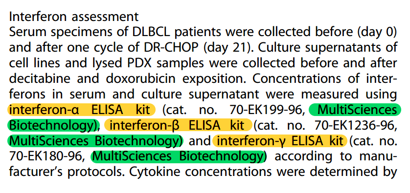 2023年10月6日,上海交通大学赵维莅等团队在Signal Transduction and Targeted Therapy (IF=39.3)在线发表题为“Human endogenous retroviruses as epigenetic therapeutic targets in TP53-mutated diffuse large B-cell lymphoma”的研究论文,该研究发现人内源性逆转录病毒(ERVs)可以作为TP53突变的弥漫性大B细胞淋巴瘤(DLBCL)的表观遗传治疗靶点。此论文使用了联科生物Human interferon-α ELISA kit(货号:EK199)、Human interferon-β ELISA kit(货号:EK1236)、Human interferon-γ ELISA kit(货号:EK180)3种检测试剂盒。