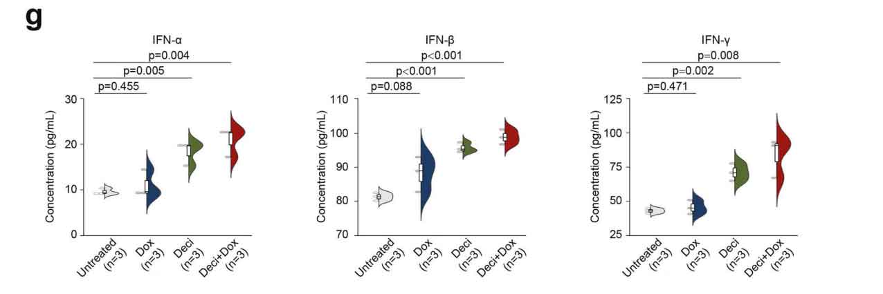 图1 与未处理组和单一处理组相比,地西他滨和阿霉素处理组的TP53mut肿瘤中IFN-α、IFN-β和IFN-γ的浓度