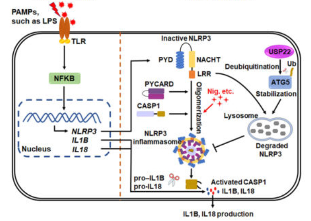 炎症小体在许多炎症疾病的发生过程中起着重要作用。炎症小体主要有NLRP1、NLRP3、NLRC4和AIM2等4个成员,其中NLRP3炎症小体研究最多。NLRP3炎性小体是激活半胱氨酸蛋白酶CASP1的分子平台,它导致促炎细胞因子IL1B/IL-1β(白介素1β)和IL18的切割和分泌。NLRP3炎性小体在宿主对感染和无菌损伤的免疫反应中起着至关重要的作用。