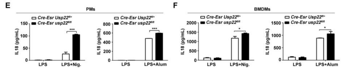 NLRP3炎性小体与多种炎症性疾病有关。为了防止过度炎症,必须严格调控炎症小体的激活。在这里,研究团队证明了USP22(泛素特异性肽酶22)促进NLRP3降解并抑制NLRP3炎症小体激活。USP22缺乏或体内沉默显著增加铝诱导腹膜炎和脂多糖诱导的全身性炎症。机制上,USP22通过促进ATG5介导的巨噬/自噬抑制NLRP3炎症小体激活。USP22通过减少ATG5在Lys118位点的K27和k48连接泛素化来稳定ATG5。这些发现揭示了USP22在调节NLRP3炎症小体激活中的作用,这可能是治疗NLRP3炎性小体或炎症相关疾病(如败血症、痛风和动脉粥样硬化)的潜在治疗靶点。