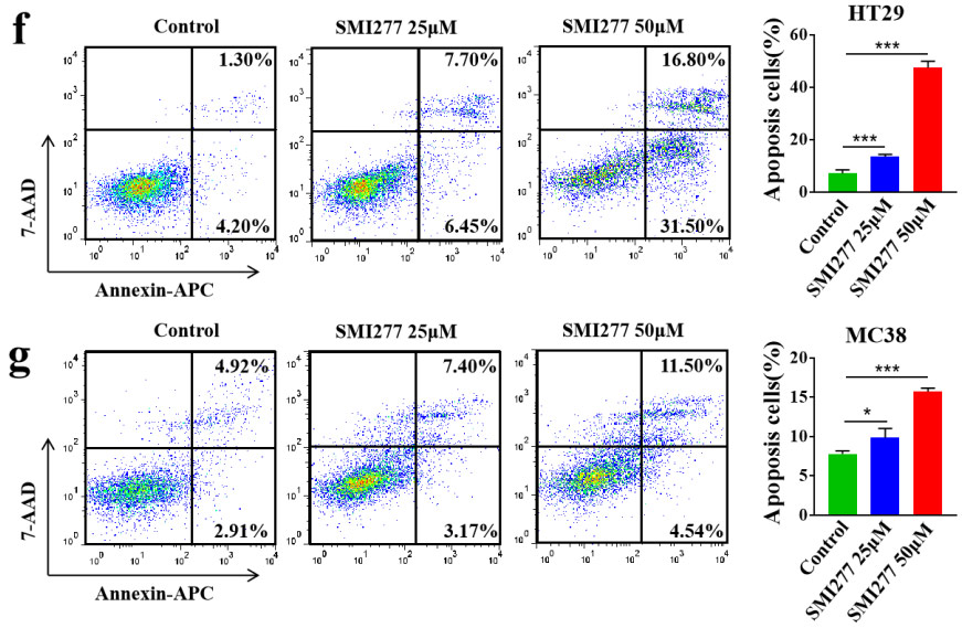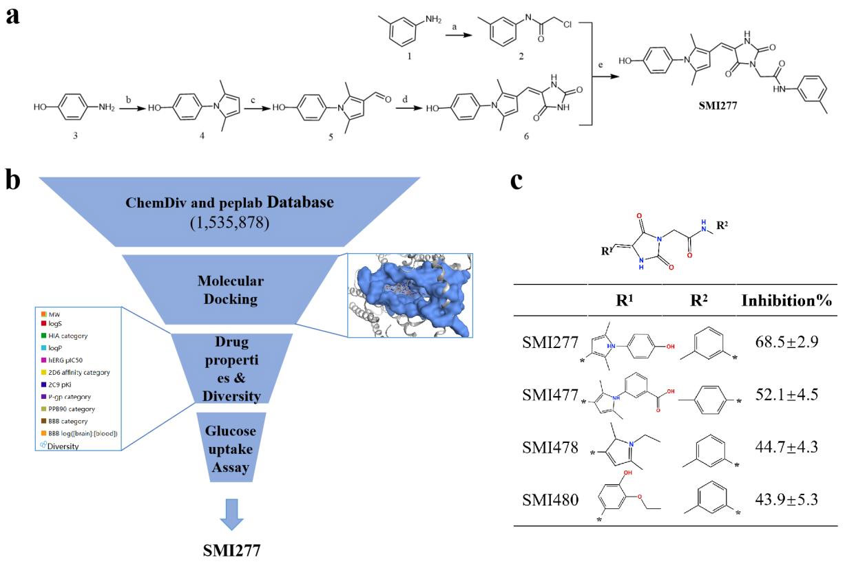 SMI277能够抑制各种肿瘤细胞对葡萄糖的吸收。与已知的GLUT1抑制剂相比,SMI277对葡萄糖的摄取表现出更强的抑制活性,抑制活性提高了40%。通过SMI277减少乳酸分泌呈剂量依赖性。SMI277能够抑制肿瘤细胞增殖,诱导肿瘤细胞凋亡。与对照组相比,10 mg/kg的SMI277处理后第21天,小鼠的肿瘤生长明显减缓,肿瘤体积减小58%。SMI277可负向调节GLUT1蛋白的表达。体外实验表明,SMI277能够增强CD8+ T细胞的应答。因此,抑制剂SMI277可能作为潜在的GLUT1抑制剂用于GLUT1+癌症治疗。
