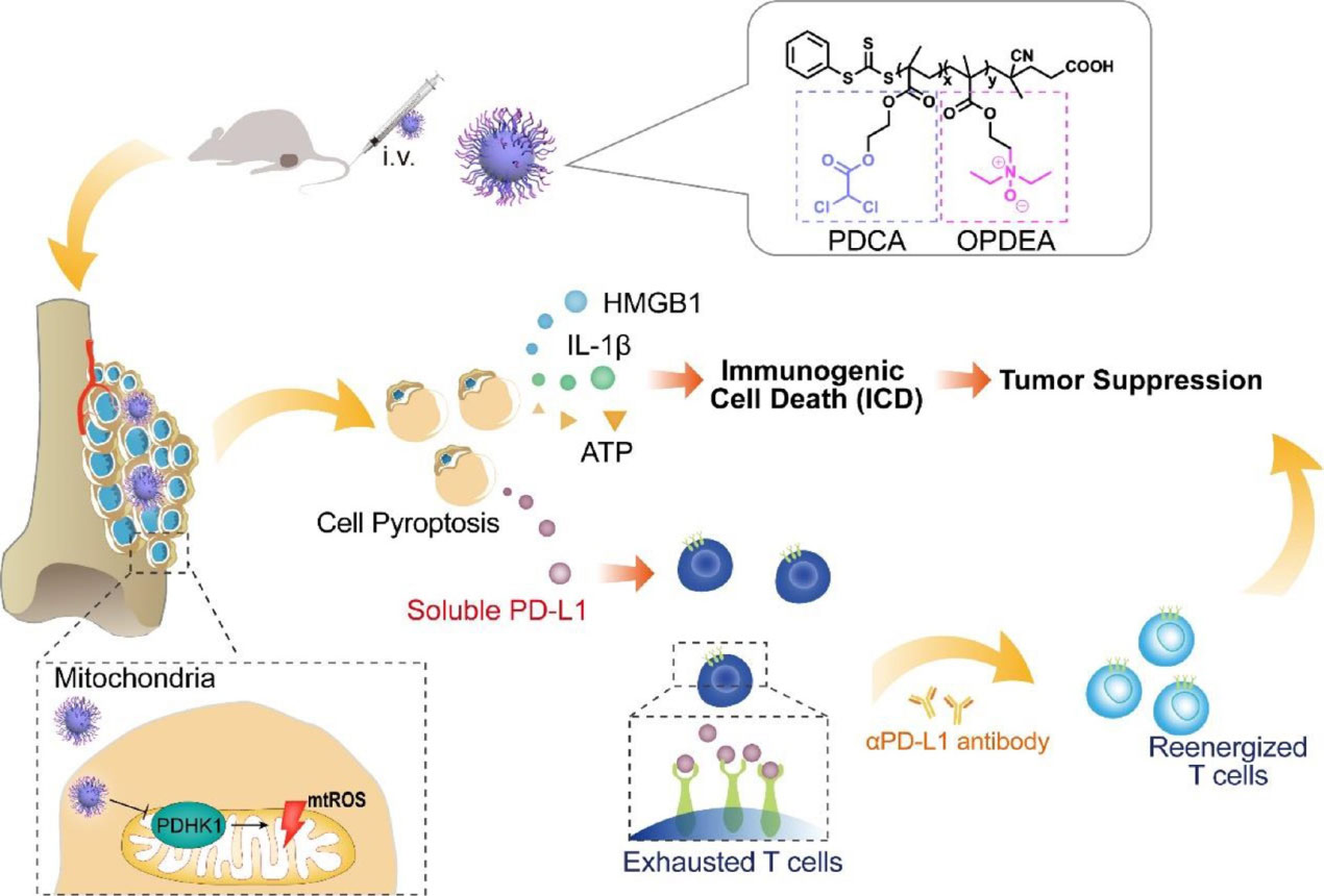 该团队合成了一种线粒体靶向聚合物胶束(OPDEA- PDCA),利用聚[2-(n -氧化物- n, n -二乙基氨基)甲基丙烯酸乙酯](OPDEA)靶向线粒体,并用共轭二氯乙酸(DCA)抑制丙酮酸脱氢酶激酶1 (PDHK1)。这种结合物通过启动线粒体氧化应激诱导焦亡。发现OPDEA-PDCA靶向线粒体,通过抑制PDHK1诱导线粒体氧化应激,导致骨肉瘤细胞系的免疫原性焦变性。此外,他们发现OPDEA-PDCA可以诱导可溶性程序性细胞死亡配体1 (PD-L1)分子的分泌。本研究提供了一种通过靶向调控线粒体启动焦亡的策略,有望与免疫治疗联合提高抗肿瘤疗效。